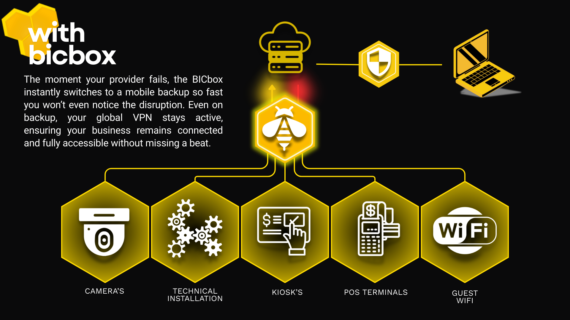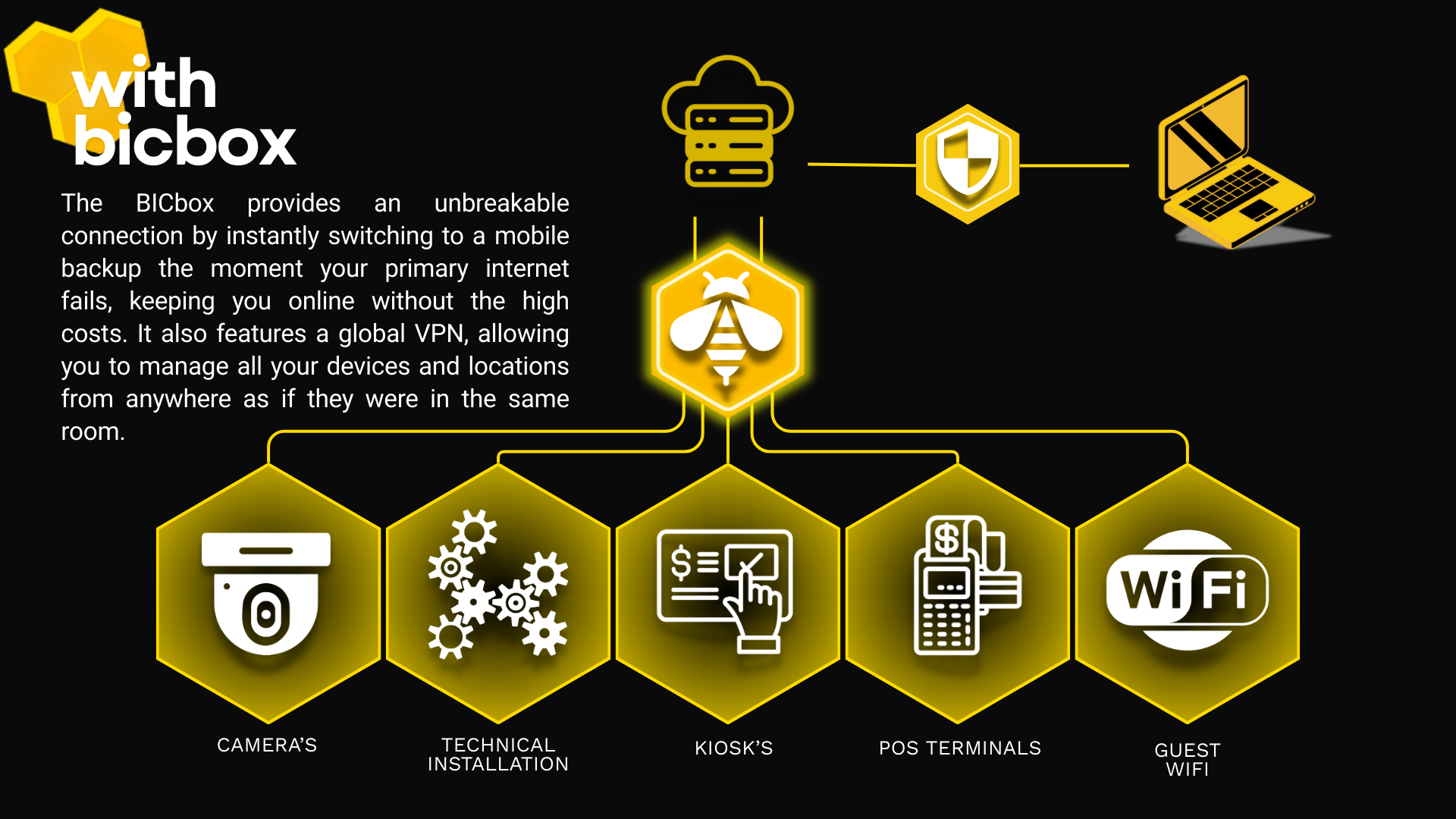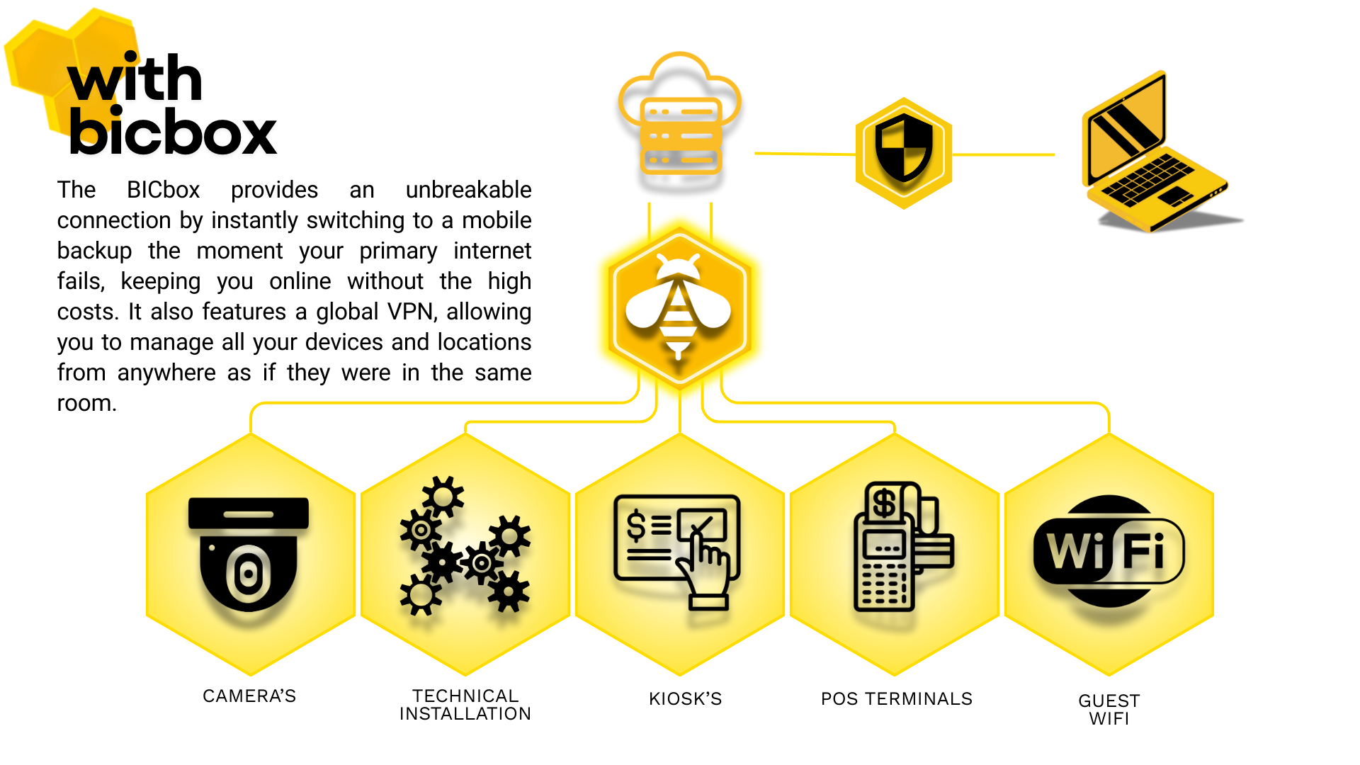 Access all the facilities you're used to, securely expandable to any location with the BICbox. The BICbox ensures you're always online.
